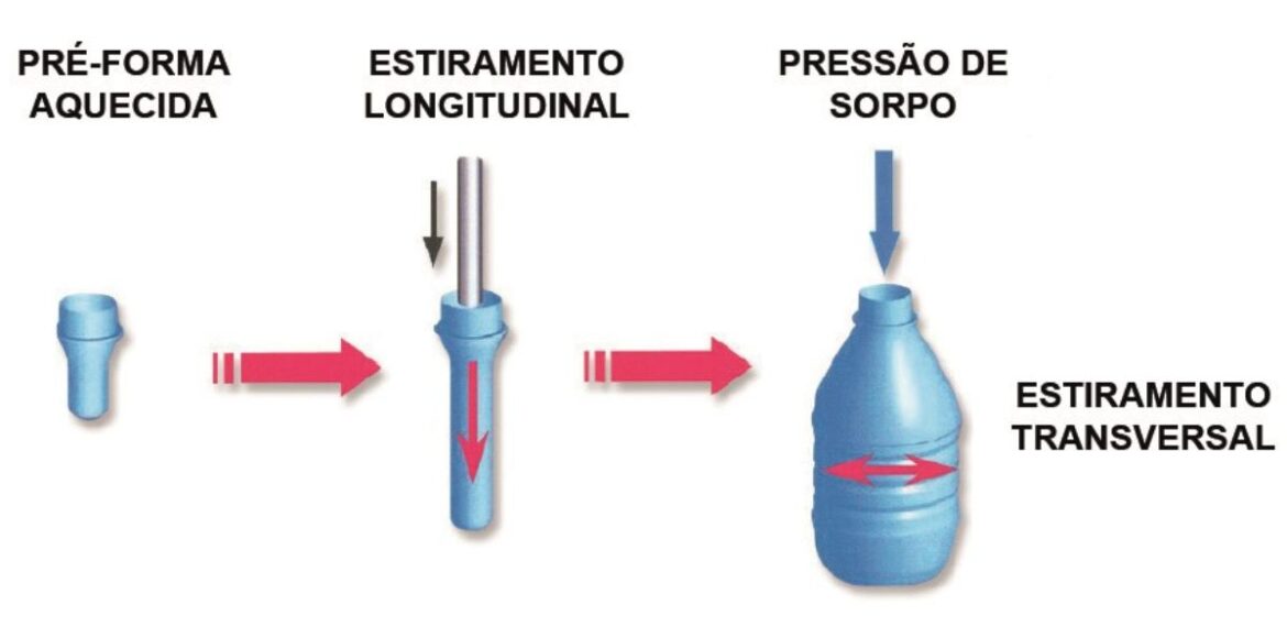 PROCESSO DE SOPRO Este processo pode acontecer de duas formas diferentes. Na primeira, pré-formas são obtidas em moldes e máquinas-injetoras convencionais, armazenadas e transferidas ou vendidas ao transformador final. Uma sopradora exclusiva para este fim recebe as pré-formas injetadas, as reaquece por radiação (sem plastificar, apenas amolecer), para que fiquem maleáveis. Depois de